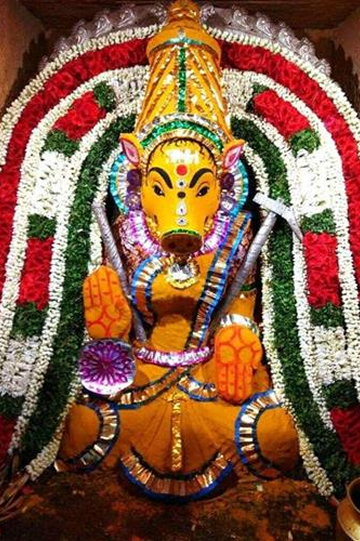 Goddess Varahi, a powerful Hindu Deity is consort of Lord Varaha (boar incarnation of Lord Vishnu). She is one of the seven Divine mothers (powerful aspects of Shakti) also known as Sapt Matrikaas. She is 5th of the Sapt Maatrikas (Brahmani, Maheshwari, Kaumari, Vaishnavi, Varahi, Mahendri and Chamundi) and therefore also known as Panchami. She is said to command the Army of Goddess Raja Rajeshwari and is said to be an epitome of Knowledge. According to an episode of Devi Mahatmya which deals with the killing of Demon Raktbija, the Maatrikas were created by warrior Goddess Durga from herself for slaughtering the Demon Army with their help. When one of the Demon Shumbha challenged Goddess Durga for a one to one combat, she absorbed the Matrikaas into herself.