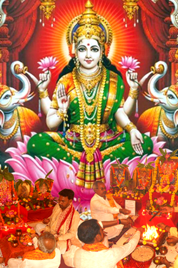 Punyaha Vachan Kalash Pujan, Shodas Matrika Pujan, Bhadra Mandal Pujan, Chhetrapal Mandal Pujan, Chausath Yogini Pujan, Sri Suktam for 108 times, Lakshmi Mantra Japa for 1100 times, Kanakdhara Stotra, Lakshmi Stotra, Homam with Ghee, Sugar, Til, Oats ( Jow ), Ashtagandh, Sandalwood powder, Navgrah Samidha and then Purnahuti, Aarti, Prasad to Brahmins